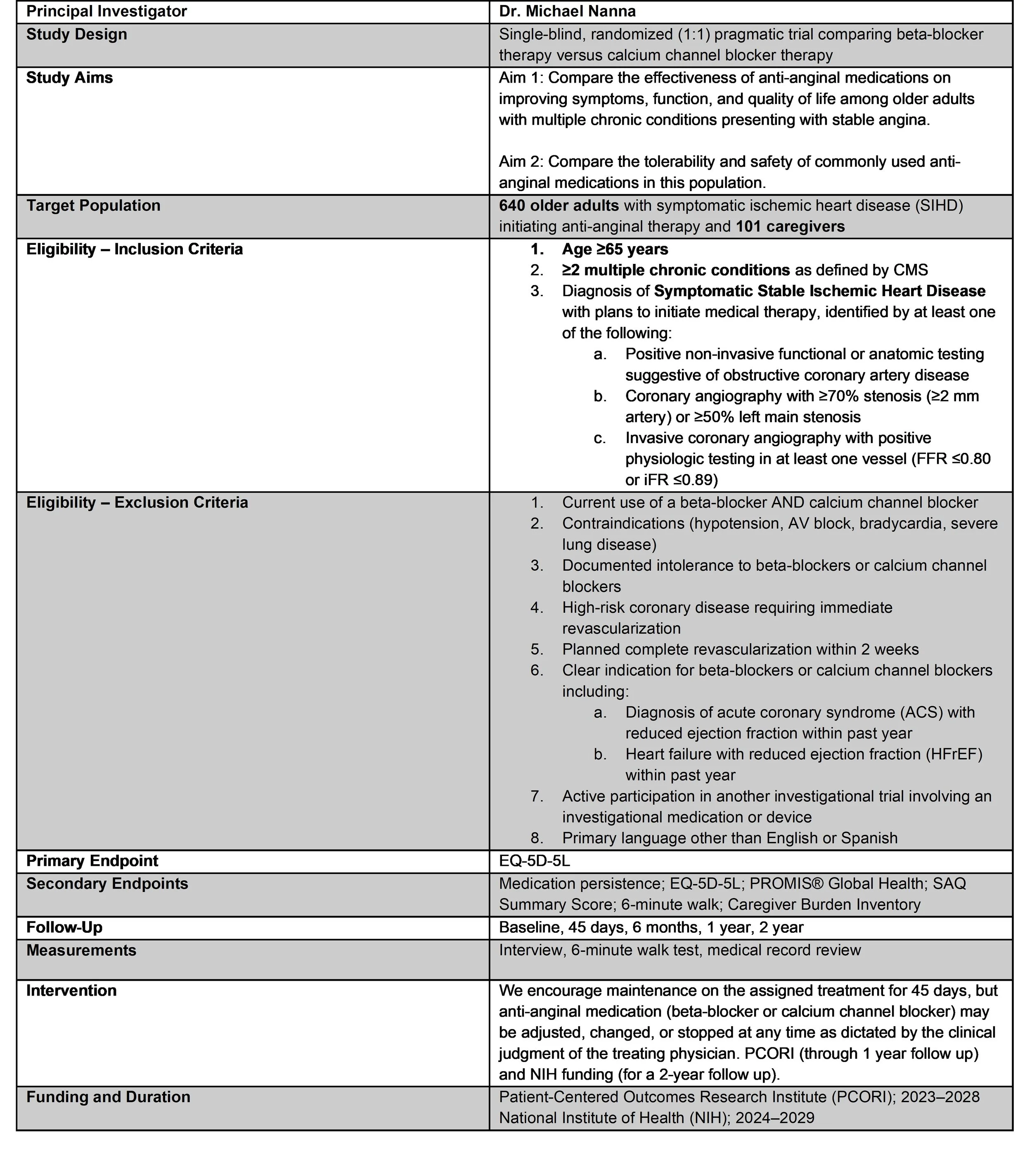 To address the question of the optimal first-line anti-anginal treatment in older adults with stable angina and multiple chronic conditions, we propose a randomized controlled trial (RCT) of the guideline-recommended medical anti-anginal therapies, beta-blockers and calcium channel blockers. The study design is summarized in the Table below.